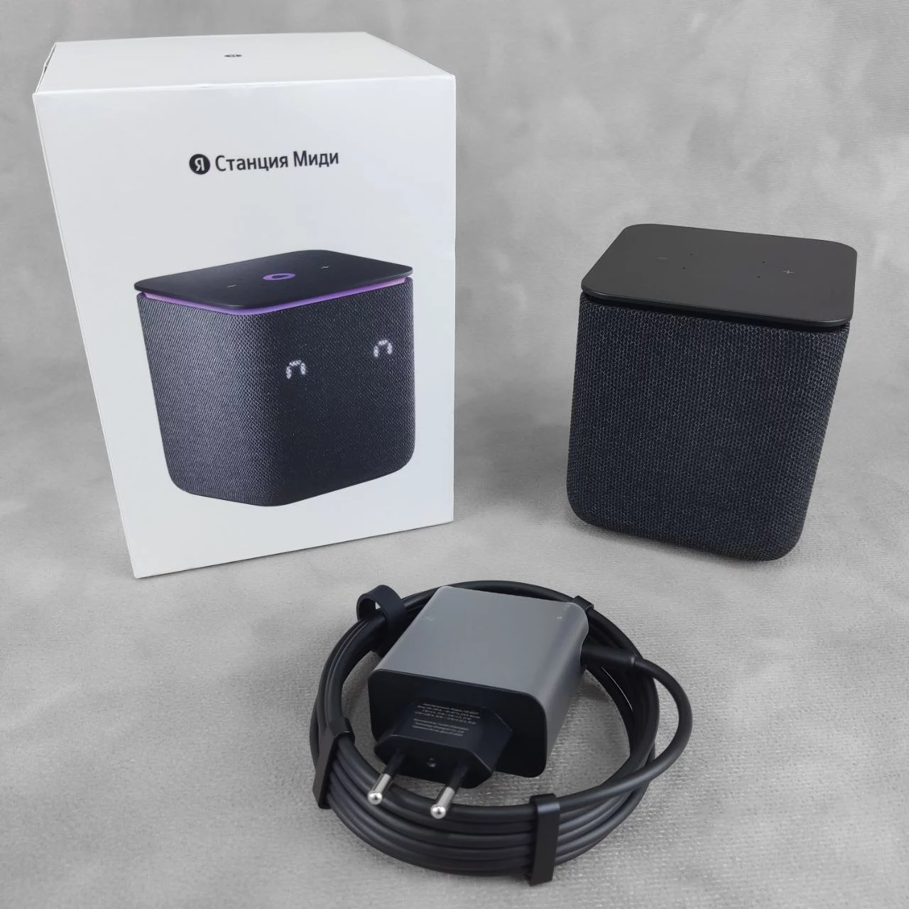Умная колонка Яндекс.Станция Миди – это стильное устройство, выполненное в корпусе с тканевой отделкой черного цвета и контурной подсветкой RGB.