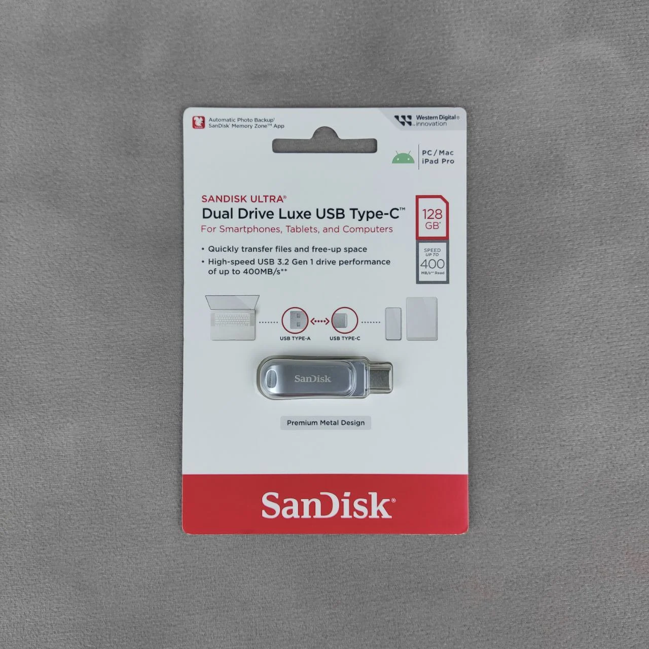 USB-накопитель SanDisk Ultra Dual Drive Luxe с интерфейсом USB Type-C и объемом памяти 128 ГБ обеспечивает скорость передачи данных до 400 МБ/с, поддерживая стандарт USB 3.2 Gen 1. Этот накопитель, заключенный в прочный металлический корпус, позволяет легко переносить файлы между устройствами, такими как смартфоны, планшеты и компьютеры Mac с разъемом USB Type-C, а также обратно на компьютеры с разъемом USB Type-A. Благодаря этому вы можете снимать больше фотографий и просматривать их на всех ваших устройствах. Компактный размер накопителя позволяет носить его в сумке или кармане. Специальная конструкция с вращающимся колпачком защищает разъемы накопителя во время транспортировки.